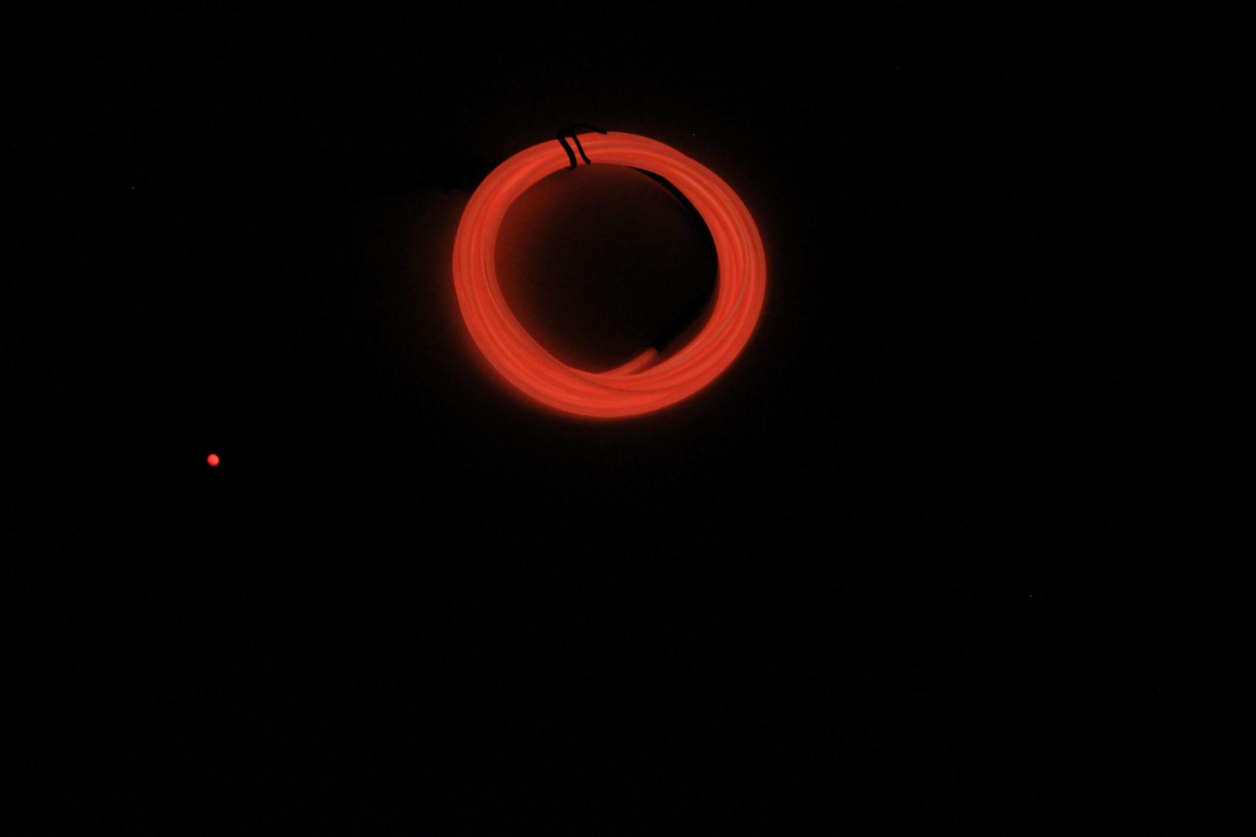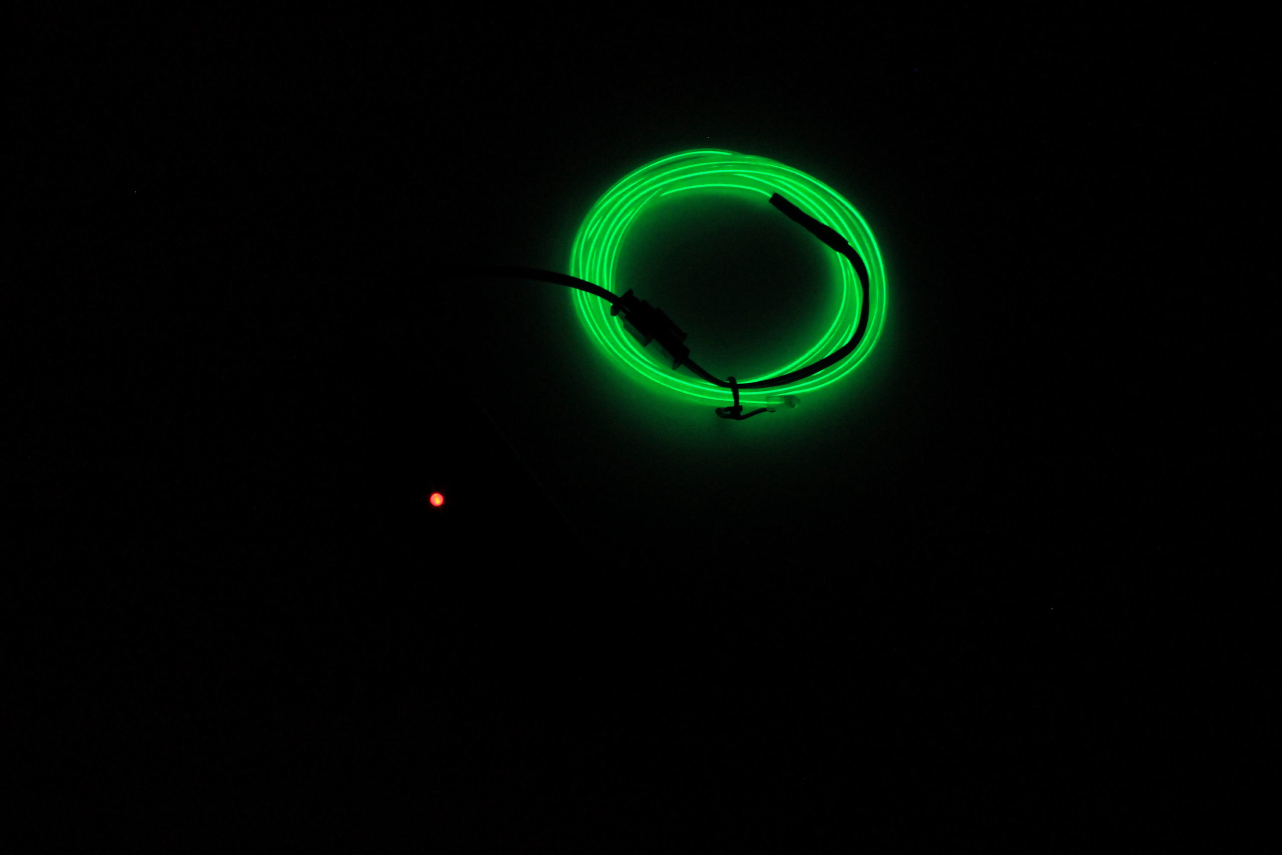 1 meter. Comes with controller, AA batteries needed to operate, batteries not included.